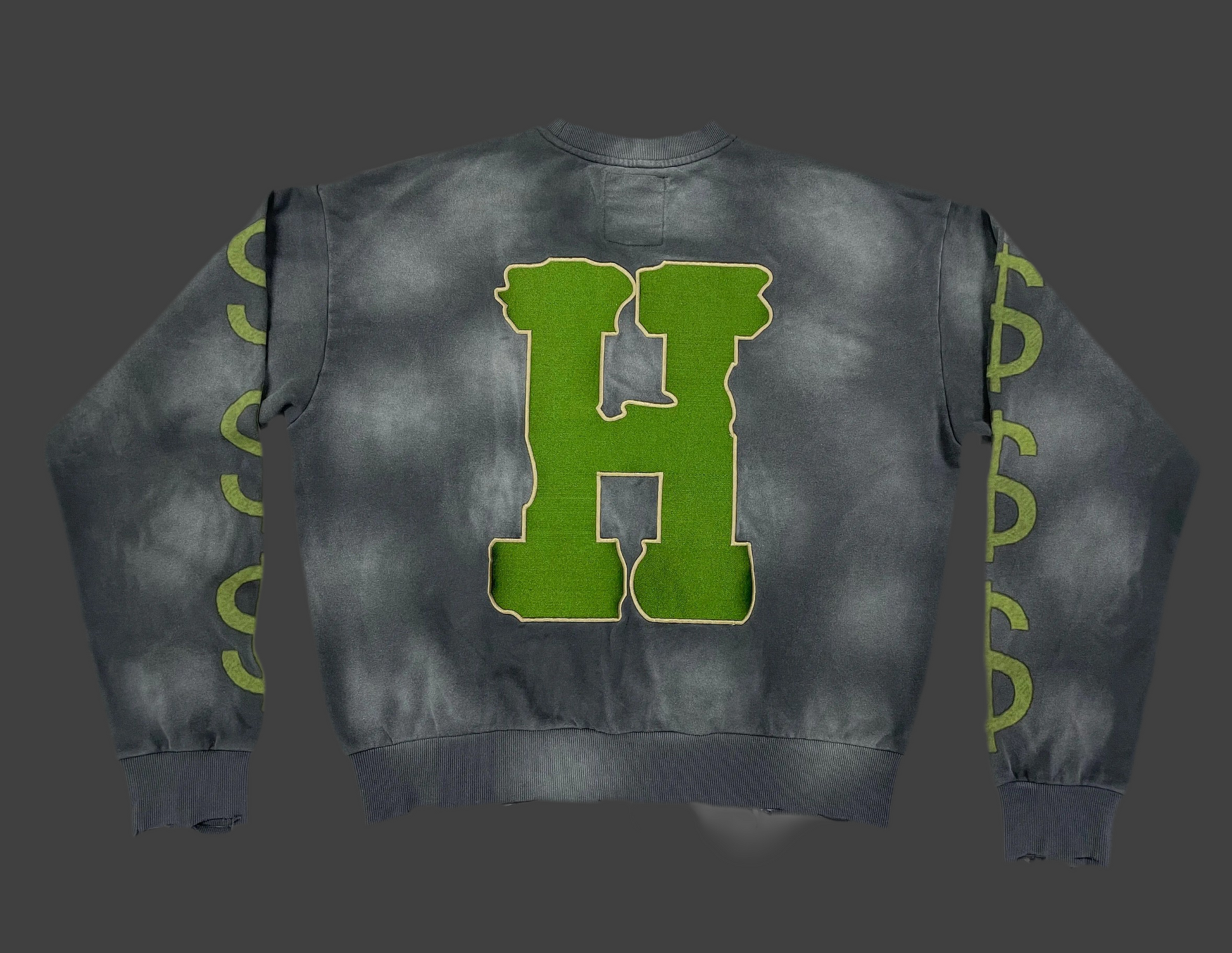 Rendered in a muted acid wash grey, the sweatshirt boasts a lived-in, vintage aesthetic with subtle tonal variations that add depth and character. Distressed details — from lightly frayed hems to artful abrasions — enhance its rugged, carefree vibe, perfect for those who crave a touch of rebellion.